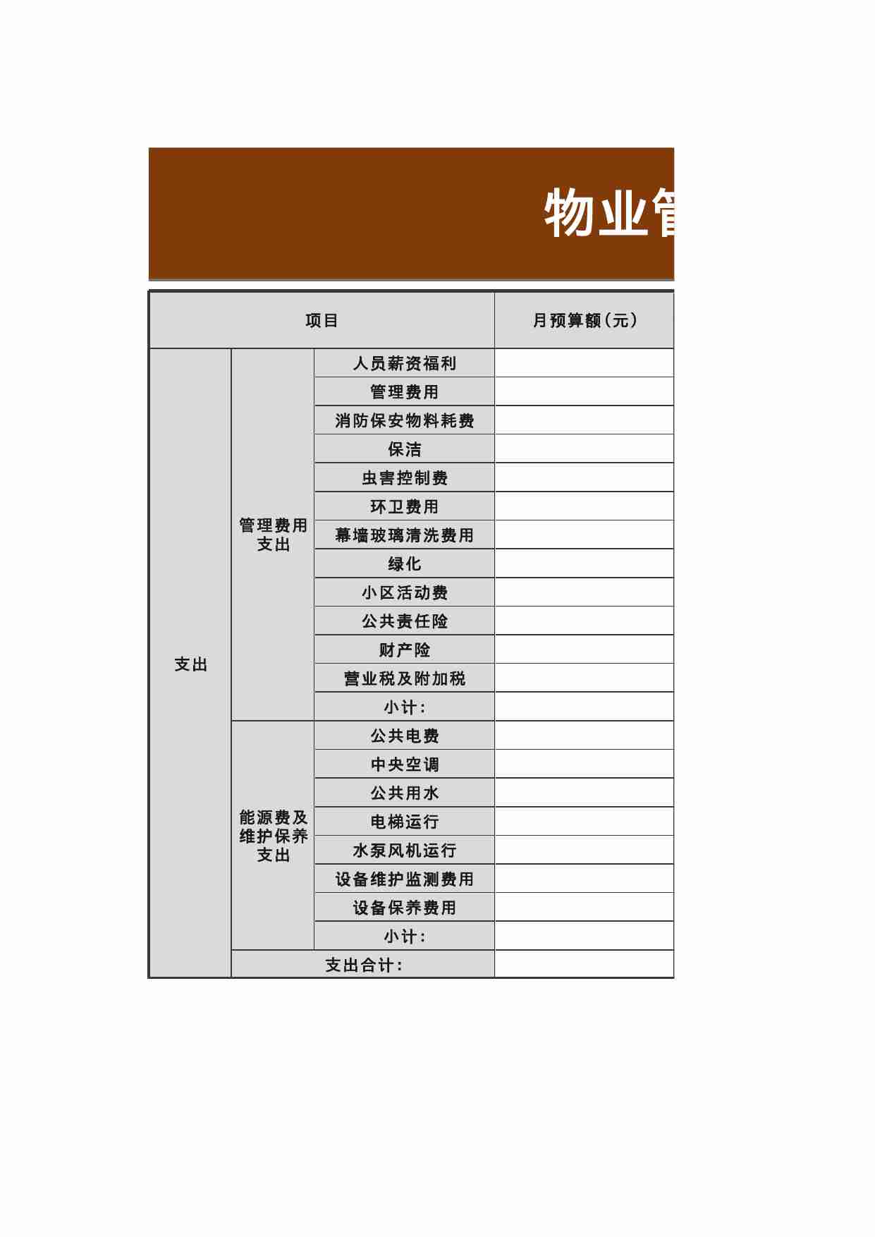 该表格清晰展示物业费收支明细,涵盖各项服务预算与决算,便于进行财务规划与成本管控分析。